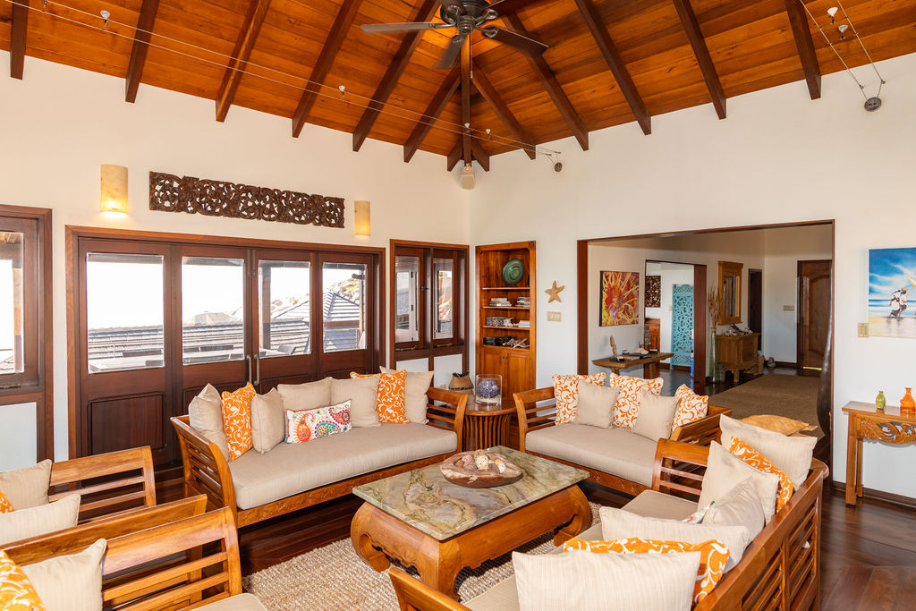Inside, Indonesian hardwood doors welcome you into a space adorned with custom-crafted furniture and hardwood floors. The open-plan living and dining areas offer seating for twelve, both indoors and on the covered deck. The kitchen, equipped with granite countertops and top-tier appliances, is perfect for preparing anything from family meals to gourmet feasts.