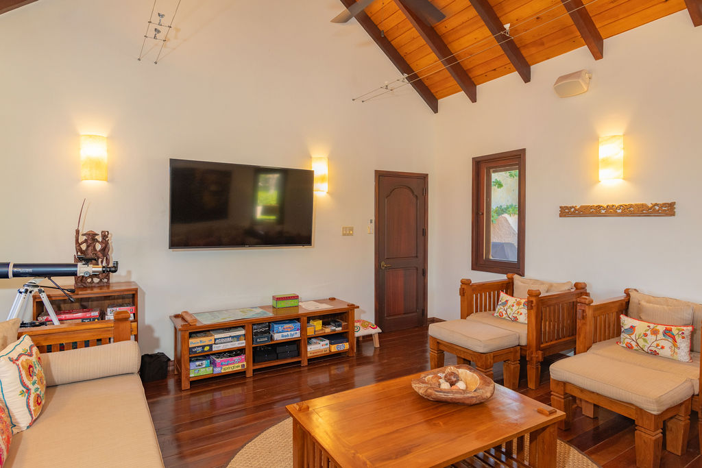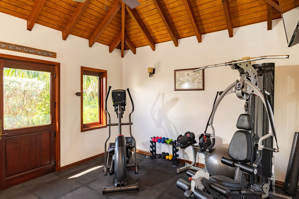 For entertainment, the air-conditioned room boasts a 60″ smart TV, surround sound, and satellite service, with Wi-Fi and a stereo system extending throughout the house and pool area. The gym, complete with state-of-the-art equipment, also includes a bathroom and a queen-sized Murphy bed.