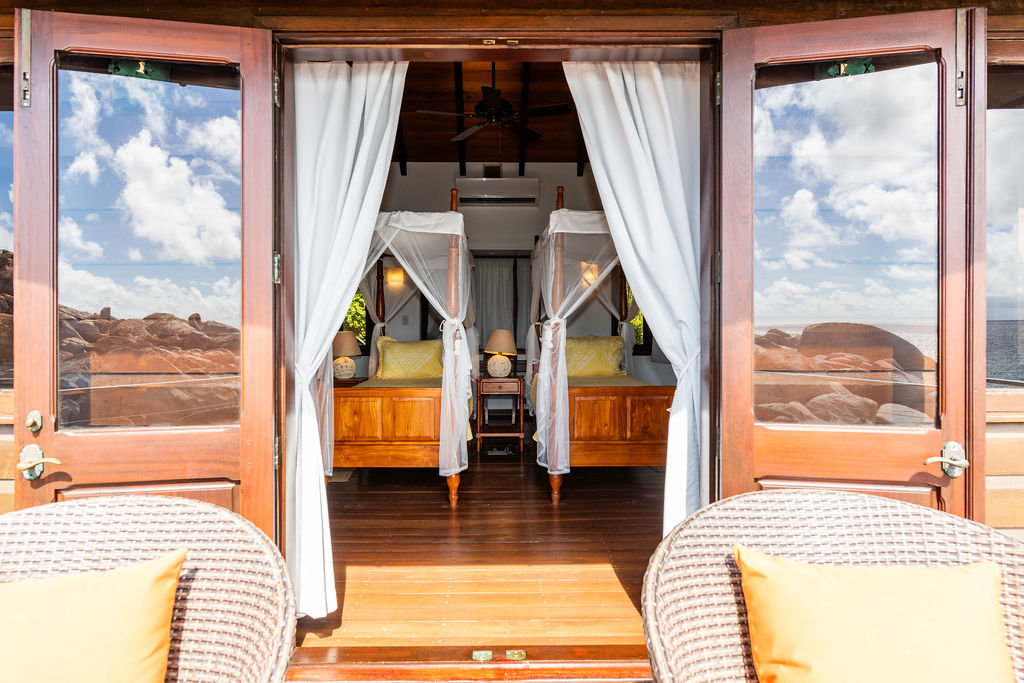 The villa’s modular layout enhances privacy across its four suites, each featuring outdoor showers and panoramic ocean views. Stone pathways wind through the lush gardens, leading to a serene infinity pool.